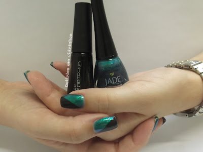 Como eu não sei ficar só com um esmalte, quis fazer uma gracinha. E o único que combinou foi o preto. Nenhum dos meus verdes ficaram legais. =/
